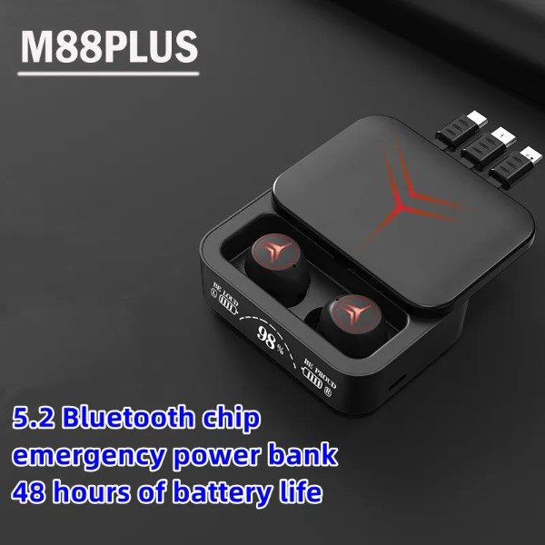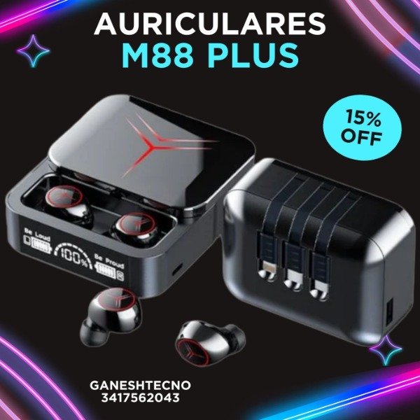 Los Auriculares M88 PLUS TWS están diseñados específicamente para los jugadores que buscan una experiencia auditiva premium. Equipados con una banda de potencia de 1200mAh, estos auriculares ofrecen una autonomía prolongada para largas sesiones de juego. Además, cuentan con 3 estilos de línea de carga, brindándote flexibilidad y comodidad al cargar tus auriculares. ¡Prepárate para sumergirte en un mundo de sonido HIFI que te pondrá en el centro de la acción! 🎮🔊